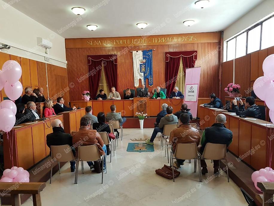 Il conto alla rovescia è partito. Con la presentazione di questa mattina nella sala consiliare del Comune è scattata a Terracina l'operazione tappa del Giro d'Italia di ciclismo, la quinta in programma con partenza da Frascati, che dovrà vedere la città pronta sotto tutti gli aspetti per l'evento del 15 maggio. "Un evento bello è complesso - ha detto il sindaco Nicola Procaccini, affiancato dall'assessore al Turismo Barbara Cerilli, dal delegato allo Sport Stefano Alla, dal presidente della FCI Latina Massimo Saurini, da Gigi Sgarbozza e, naturalmente, dall'organizzatore Tiziano Testa, patron del Gsc Desco e del Trofeo Falcone - che vedrà la città all'attenzione del mondo. Evento che dedicheremo alla memoria, a distanza di 50 anni, del compianto Giancarlo Manzi che morì nel 1969 in occasione della tappa del Giro a causa del crollo di una tribuna". Lo stesso Testa ha aggiunto: "900 milioni di persone seguiranno l'evento e solo questo dato rende l'idea dell'importanza di questa tappa". Cerilli ha sottolineato come "tutto è stato possibile grazie al gioco di squadra e all'impegno di tutti gli uffici comunali. Quel giorno Terracina dovrà vestirsi di rosa e per questo chiediamo la collaborazione di tutta la cittadinanza e delle attività commerciali".
