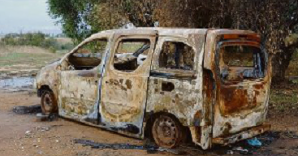 Un’auto abbandonata ai margini dei campi, e in mezzo alle sterpaglie cumuli di rifiuti e scarti di veicoli.