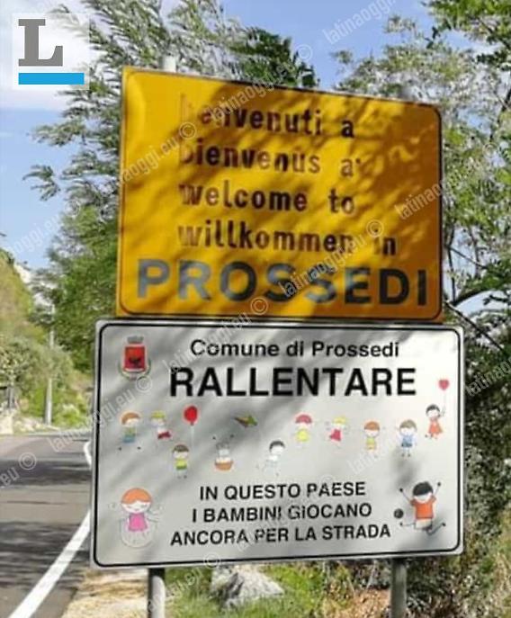 Oltre al vecchio segnale giallo scritto in più lingue, infatti, ne è apparso uno bianco che recita testualmente: "Comune di Prossedi - RALLENTARE - In questo paese i bambini ancora giocano per la strada".