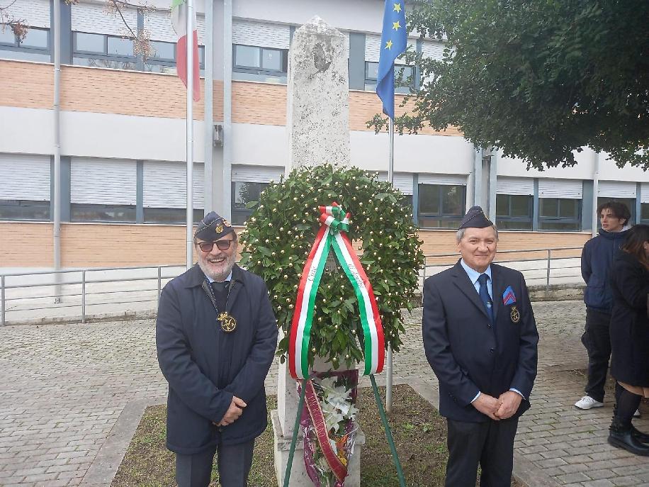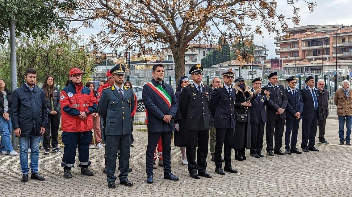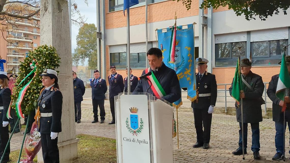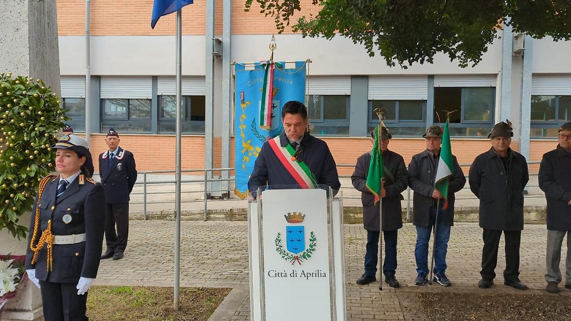 Al cospetto dei rappresentanti delle forze dell'ordine, delle associazioni combattentistiche e d'arma, degli studenti del Liceo Meucci, l'amministrazione ha deposto una corona di alloro e l'associazione Un Ricordo per la pace con il presidente Elisa Bonacini ha deposto un omaggio floreale. Nel suo discorso il vice sindaco di Aprilia Vittorio Marchitti ha voluto ricordare il significato storico della giornata per la città di Aprilia e veicolare un messaggio di pace da tramandare alle nuove generazioni. Dopo di lui gli studenti della 5° Z dell'Istituto Superiore Meucci e la professoressa Federica Calandro, hanno ricordato l'impegno profuso da Harry Shindler nella ricerca dei resti dei soldati britannici caduti in Italia e nella ricostruzione della storia di alcune importanti pagine per la storia del nostro territorio. Infine, dopo il discorso sulle vittime sacrificali, tenuto dal professor Giovanni Raponi, è stata presentata l'opera "Presso il fontanile. In memoria di Domenico Volpi", che l'artista Antonio De Waure ha voluto donare all'istituto superiore di Aprilia.