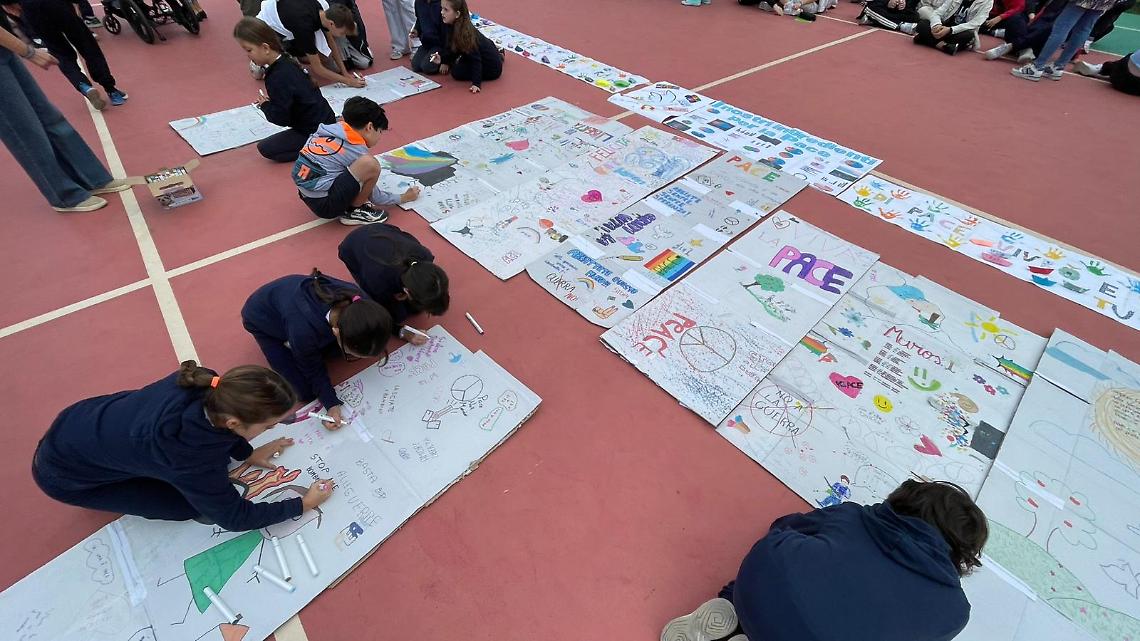 Nel plesso di Via Amaseno, la manifestazione si è svolta all’aperto, presso il campo sportivo. Qui, i vari gruppi si sono alternati con interventi e performance che hanno emozionato e fatto riflettere: tra i momenti più toccanti, la lettura della poesia “I giovani liberi” di Haidar al-Ghazali, i pensieri personali degli alunni, la presentazione di un grande muro-cartellone con murales raffiguranti le barriere che ancora oggi separano i popoli – come quelle tra Israele e Cisgiordania o tra Messico e Stati Uniti.