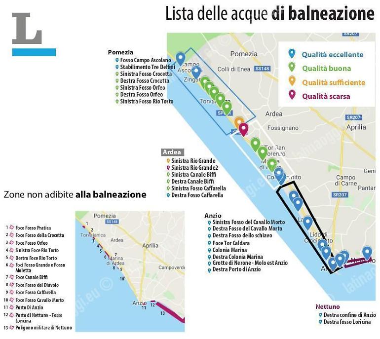 Dal confine con Ostia a quello con Latina, il litorale a sud di Roma offre punti in cui l'acqua è talmente limpida da potersi specchiare, altre zone dove nel tempo la sua qualità è migliorata, altre ancora dove c'è da lavorare. In più, ci sono le "solite" foci dei fossi, che restano un nodo ancora parzialmente irrisolto, e la situazione del Poligono militare di Nettuno, dove c'è il tratto di costa forse più particolare e incontaminato del Lazio - inclusa Torre Astura - che non è balneabile vista la presenza di una zona della Difesa.