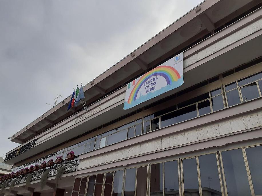 Un enorme striscione con la scritta "Andrà tutto bene" affisso dal balcone del municipio di piazza Roma. È questa l'iniziativa presa dal Comune di Aprilia eper incoraggiare la cittadinanza in questo momento di difficoltà per l'emergenza Coronavirus. Per questo il sindaco Antonio Terra ha commissionato la realizzazione di uno striscione con l'arcobaleno, che è stato esposto questa mattina dalla sede principale del Comune. Un messaggio di incoraggiamento per i contagiati, per il personale medico impegnato a fronteggiare l'emergenza ma anche per tutti i cittadini, chiamati a rispettare un periodo di limitazioni per evitare la diffusione del virus.
