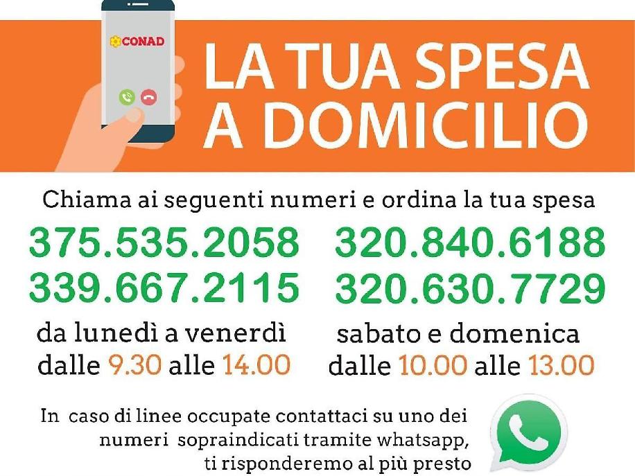 Conad al servizio dei consumatori più in difficoltà in questo momento di emergenza e restrizioni per quanto riguarda il rischio sanitario per il Covid - 19. Sono stati attivati i numeri da chiamare per ordinare la spesa e farsela consegnare direttamente a casa, con consegna gratuita con ordine minimo di 90 euro.