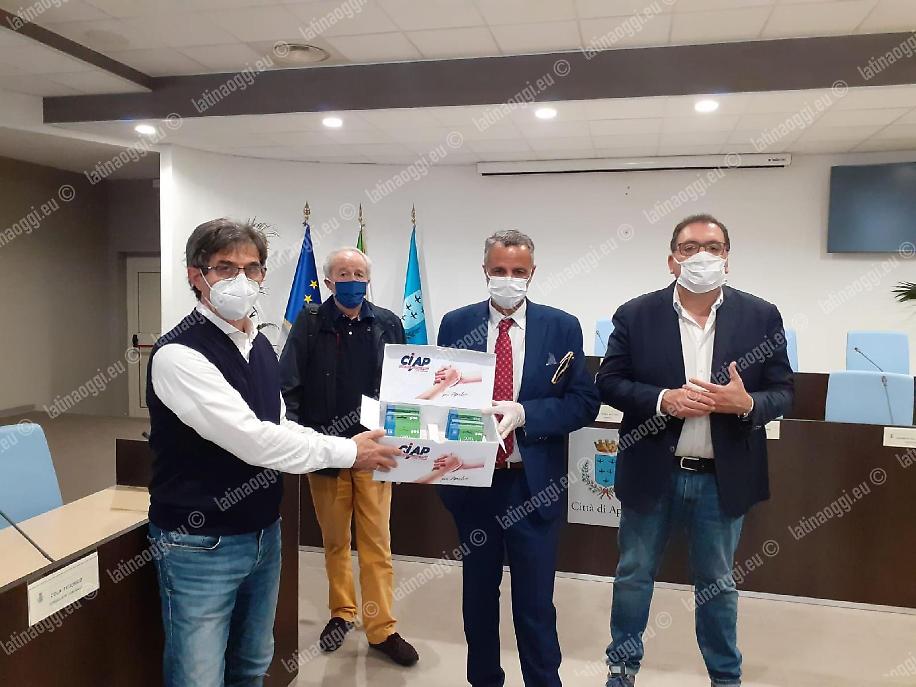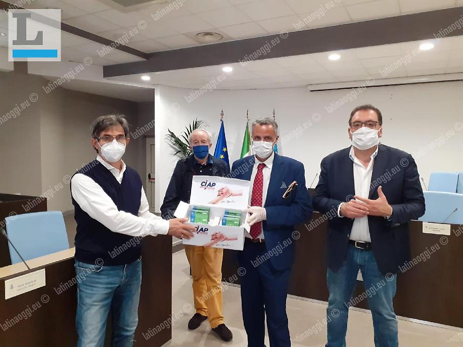 Il Consorzio Industriali di Aprilia (Ciap) dona 108 buoni spesa alla famiglie in difficoltà a causa dell'emergenza Coronavirus. Questa mattina nell'aula consiliare di piazza Roma si è svolta la cerimonia di consegna, alla presenza del sindaco Antonio Terra, del presidente del Ciap Marco Braccini, del vice presidente Gianmichele Diana e del referente della rete dei Banchi Alimentari e delle associazione delle rete Aprilia Solidale del terzo settore, Salvatore Saraniti.