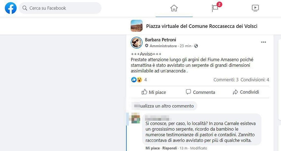 «Prestate attenzione lungo gli argini del Fiume Amaseno poiché stamattina è stato avvistato un serpente di grandi dimensioni assimilabile a un'anaconda».