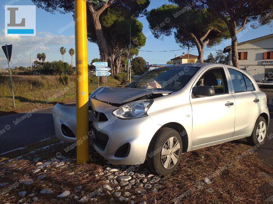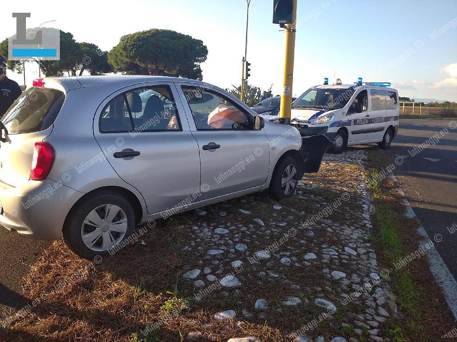 Per cause in fase di accertamento da parte degli agenti della polizia locale, una Nissan Micra con a bordo padre e figlia, rispettivamente di 73 e 45 anni, entrambi di Latina, è finita contro l'impianto semaforico all'altezza dell'intersezione dove da una parte si va verso Borgo Grappa e dall'altra, percorrendo via Litoranea, si va verso via del Mare. Le due persone fortunatamente non hanno riportato gravi ferite e sono state trasportate al Santa Maria Goretti, quando sono arrivati i soccorritori erano coscienti.