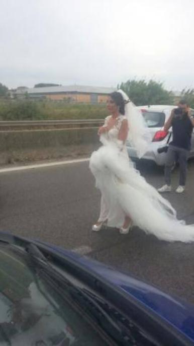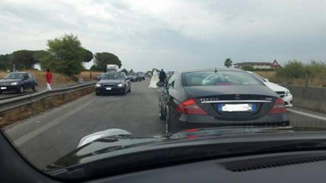 Sposa bloccata nel traffico della Pontina, fa spostare le auto e la percorre contromano