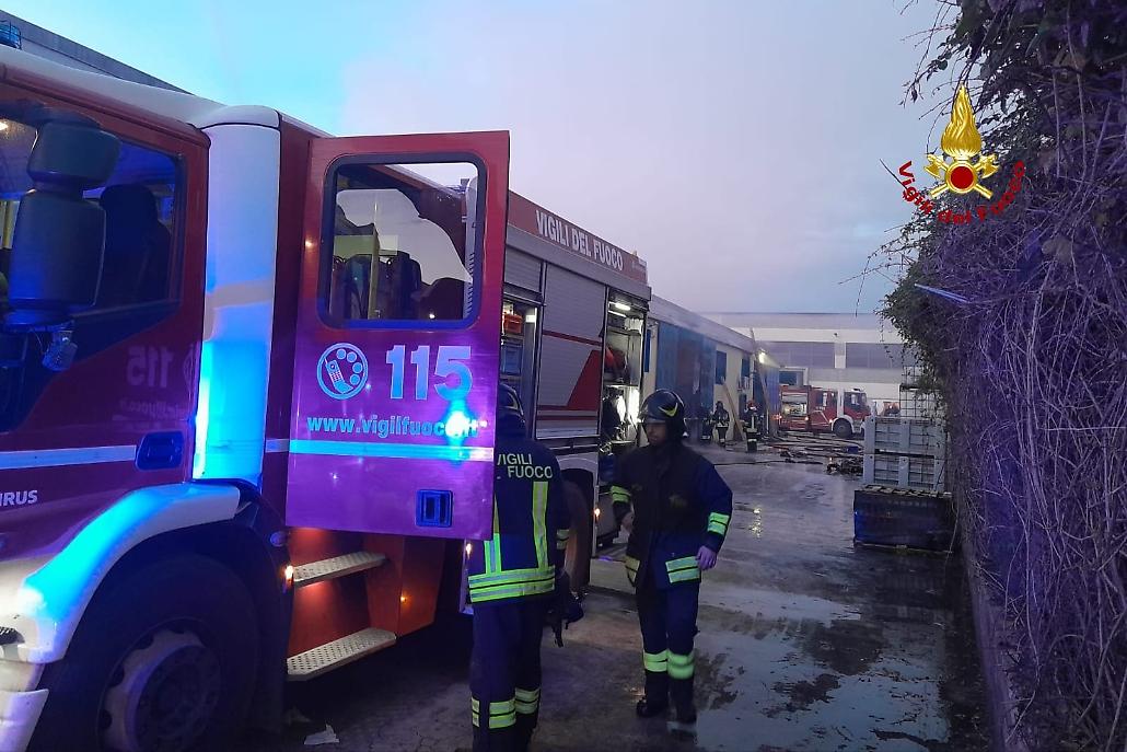 Le fiamme si sono sviluppate all’interno di un capannone di circa 2.500 metri quadrati, con copertura in predalles, coinvolgendo diversi materiali presenti nell’area produttiva: cartoni, cassette in plastica, oli vegetali e prodotti dolciari. L’intensità dell’incendio ha provocato anche il parziale crollo del solaio, rendendo l’intero edificio non agibile per motivi di sicurezza.