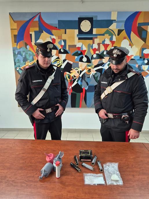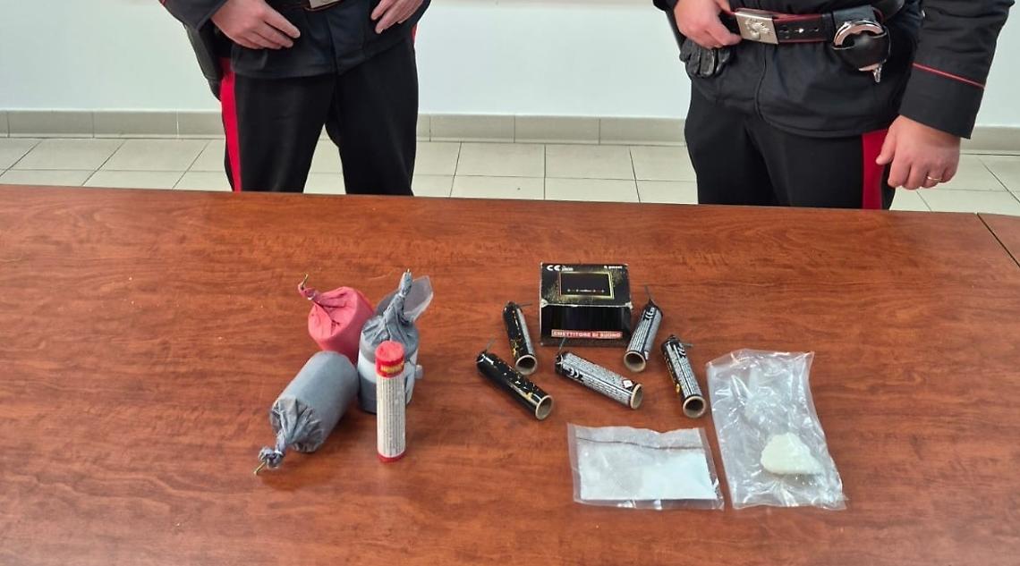 I Carabinieri hanno sottoposto a controllo l'indagato, insospettiti dal suo atteggiamento, trovando nelle disponibilità del ragazzo circa 50 grammi di cocaina e un bilancino di precisione. La perquisizione è stata estesa all'abitazione dell'indagato, dove sono state rinvenute 3 bombe carta di fabbricazione artigianale e 6 artifizi pirotecnici, in assenza della prevista licenza.