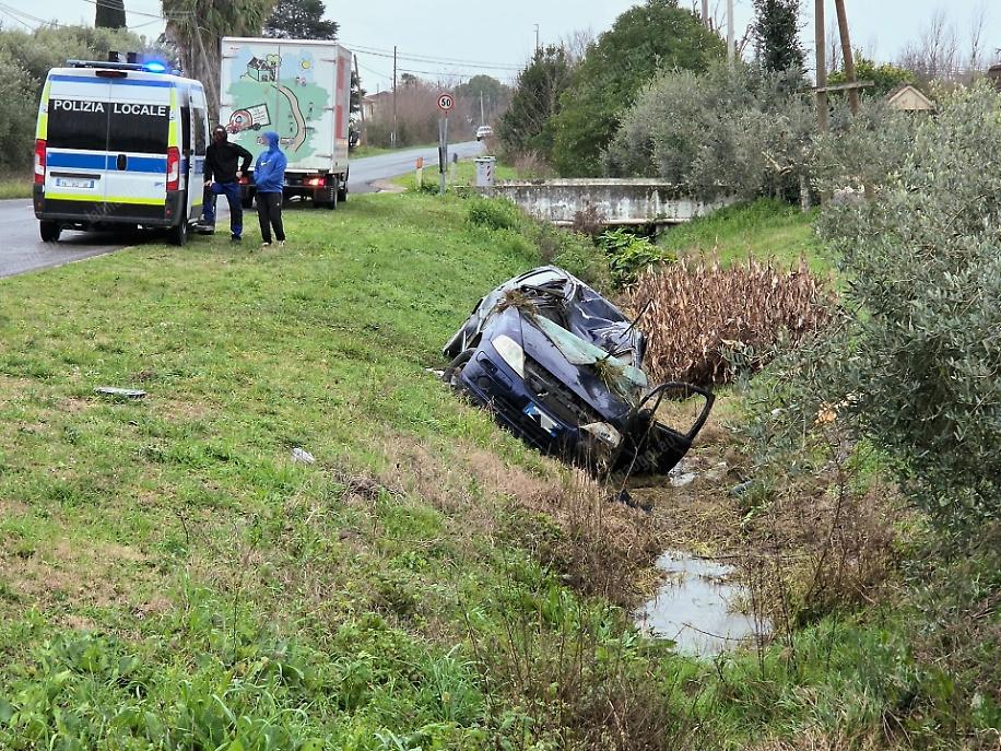 Lo schianto si è registrato in strada Congiunte Destre, dove la vettura è finita nel fosso che costeggia la carreggiata fermandosi sottosopra: l’utilitaria si è accartocciata, ma la giovane automobilista indossava la cintura di sicurezza e non ha riportato gravi conseguente e non ha mai perso conoscenza: è stata trasportata in ambulanza presso l’ospedale Santa Maria Goretti per gli accertamenti medici e le cure del caso.