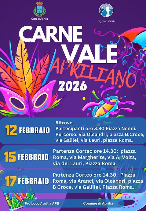 Tre sfilate con i gruppi mascherati delle scuole ma senza carri allegorici. Quella 2026 sarà un’edizione in tono minore del Carnevale Apriliano, ma quantomeno la tradizionale manifestazione che da sempre caratterizzata la città si svolgerà, per la gioia dei bambini. I contrasti tra il Comune di Aprilia e l’Abca riguardo i pagamenti dei canoni per l’autoparco di viale Europa (sede dove vengono realizzate i giganti di cartapesta) ha portato l’associazione delle botteghe dei carristi a non partecipare questo all’evento, tuttavia la Pro Loco di Aprilia in collaborazione con l’amministrazione comunale ha organizzato tre giorni di eventi coinvolgendo come le scuole e le loro coloratissime sfilate che sfileranno per le strade del centro.