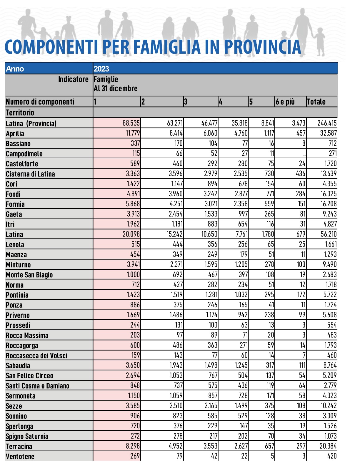 All’estremo opposto c’è un’altra provincia. Cisterna di Latina si ferma al 24,65% di famiglie mononucleo. Pontinia al 24,86%. Spigno Saturnia al 25,34%. Sermoneta al 28,58%. Priverno al 29,76%.
