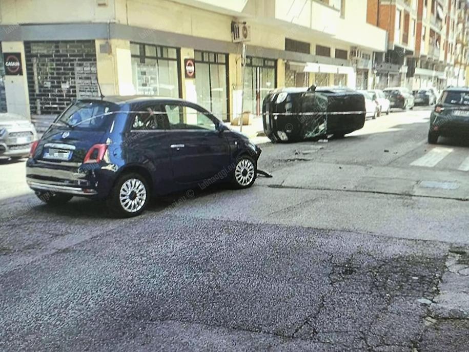 Un rocambolesco incidente si è registrato stamattina intorno alle ore 9 nella zona di piazza Santa Maria Goretti, all'incrocio tra via Montesanto e via Saffi, nel centro di Latina. Per un caso di mancata precedenza, una Fiat 500 e una Fiat Panda si sono scontrate al centro dell'intersezione e in seguito all'impatto laterale una delle due si è ribaltata, finendo su un fianco al centro della carreggiata.