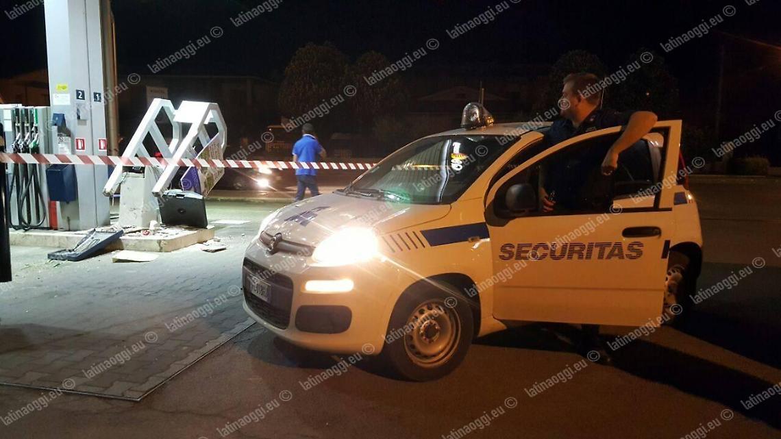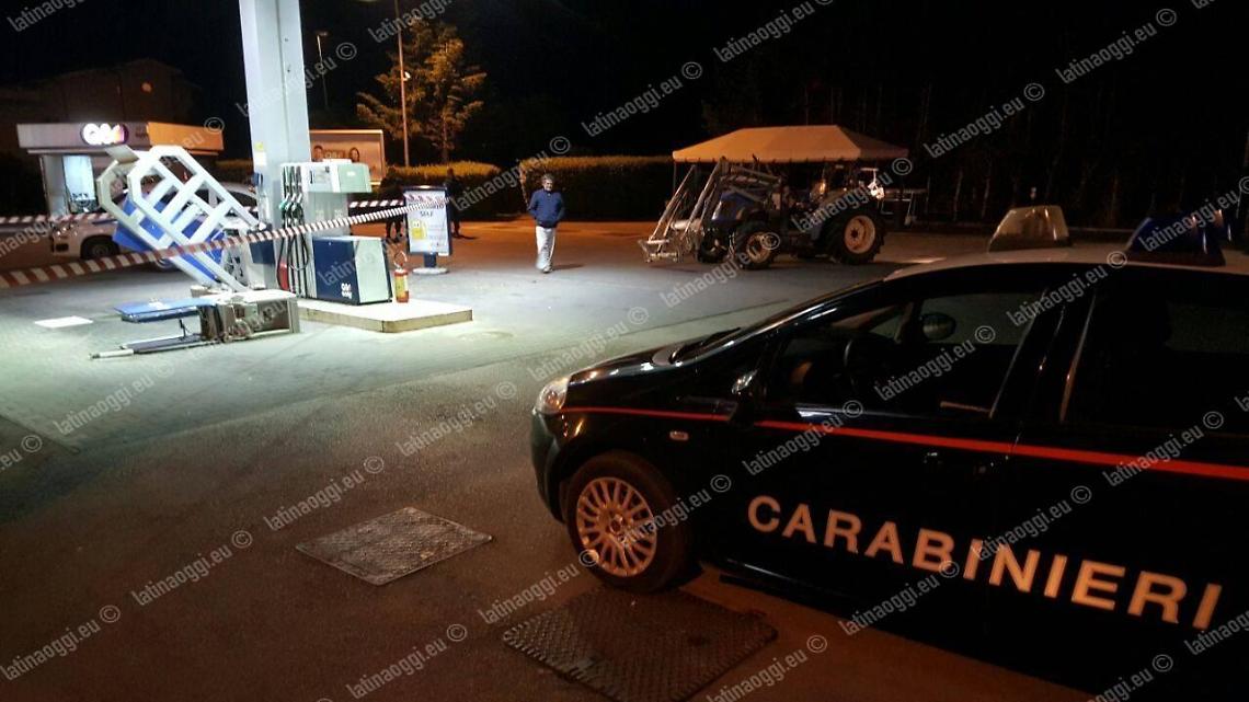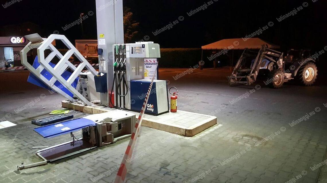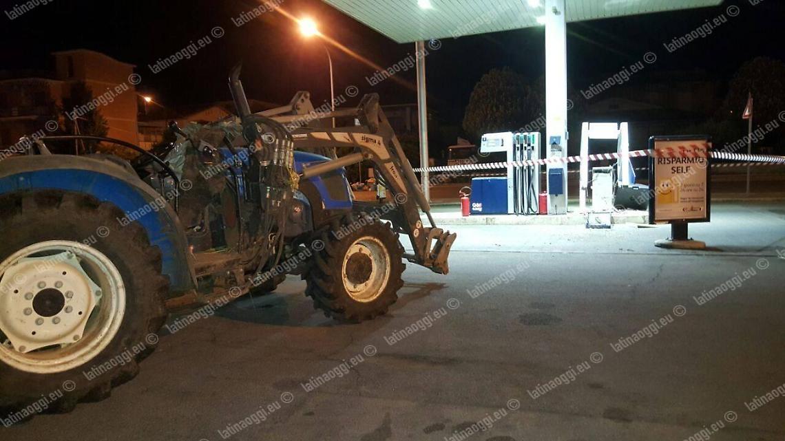 Hanno utilizzato un trattore come ariete i ladri che stanotte hanno cercato di portare via la cassaforte del distributore automatico di carburanti in via del Murillo a Latina Scalo, ma nonostante i danni ingenti il furto è sfumato. Il piano della banda di scassinatori, almeno cinque e tutti incappucciati, è scattato intorno alle 2:30 quando si sono presentati alle pompe di benzina con un mezzo agricolo rubato da un'azienda che si trova poco lontano: colpendoli più volte con la benna anteriore hanno abbattuto prima la gabbia protettiva, poi l'accettatore di banconote del self service, ma non hanno fatto in tempo a fare lo stesso con la cassaforte perché le guardie giurate dell'istituto privato di vigilanza Securitas Metronotte sono state più veloci di loro. I vigilantes sono piombati sul posto in una manciata di secondi quando è scattato l'allarme, costringendo gli scassinatori alla fuga precipitosa a bordo di un furgone bianco che doveva servire a caricare la refurtiva.