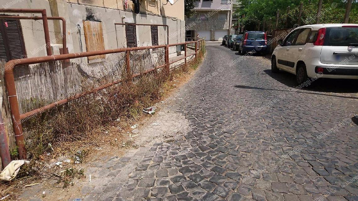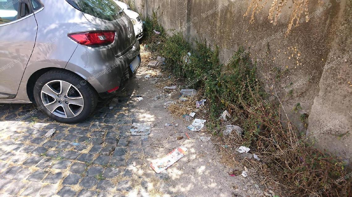 Erbacce alte anche un metro, a ridosso delle pertinenze delle case popolari; rampicanti e altre erbacce lungo il muro che costeggia la ferrovia; rifiuti sparsi ovunque; un'auto abbandonata e sampietrini sconnessi.