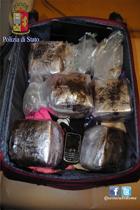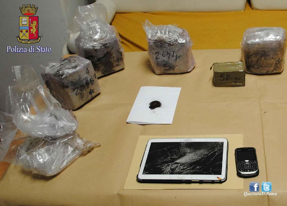 Malgrado la reticenza di A.T. i poliziotti, attraverso un mazzo di chiavi trovato in suo possesso, sono riusciti ad individuare l'appartamento, a Genzano di Roma, dove era ospitato da alcuni mesi. Durante la perquisizione, nella mansarda, è stata rinvenuta una valigia contenente sette panetti di hashish per un peso di oltre 12 chilogrammi, che sono stati sequestrati.
