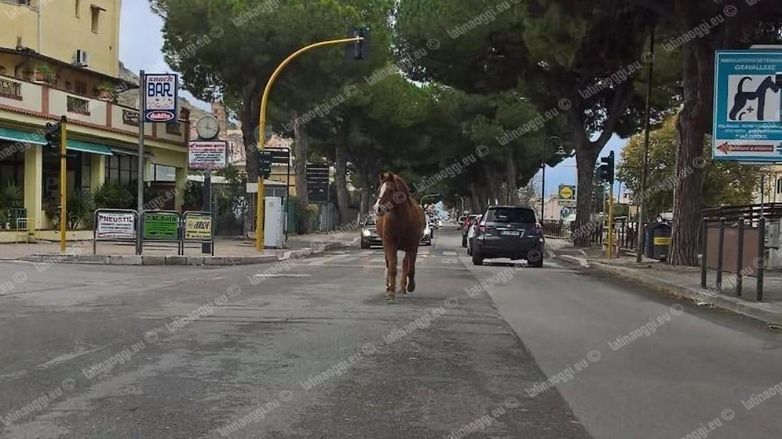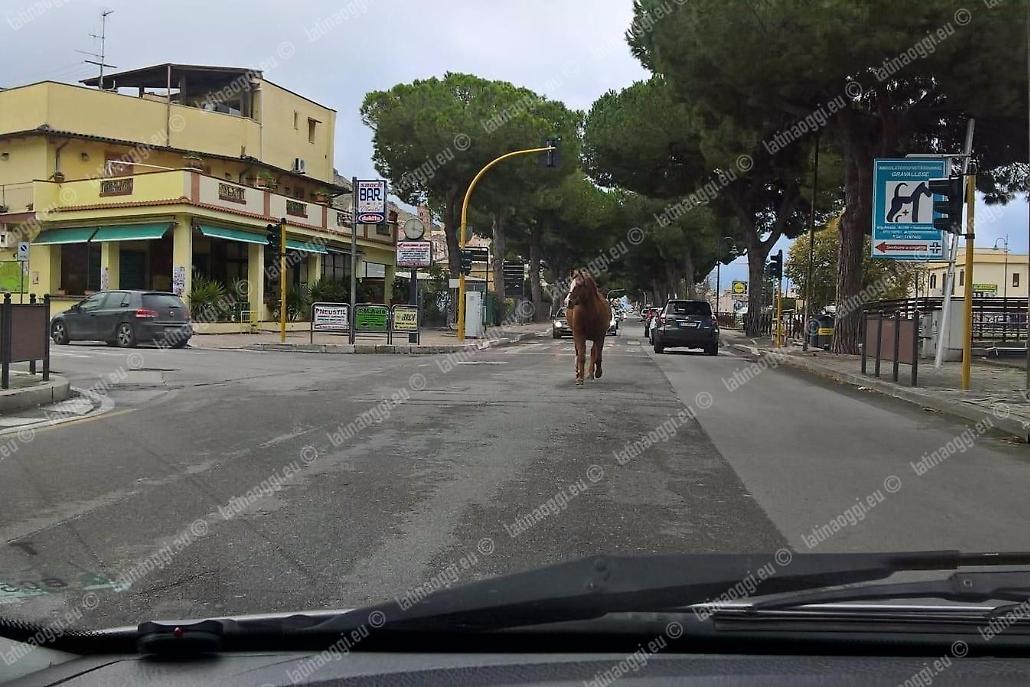 Questione di minuti, ma sono stati minuti di curiosità e stupore quelli di oggi pomeriggio a Terracina. Durante il lento pomeriggio domenicale, all'altezza del semaforo tra via Olmata e via Appia, tra le auto che percorrevano la carreggiata è spuntato un cavallo. Proprio così, un cavallo bellissimo e possente che per un momento ha riportato tutti indietro di anni. L'animale, evidentemente scappato, si è ritrovato in mezzo alle automobili, ma non è sembrato granché turbato. Dopo pochi minuti il proprietario lo ha recuperato.