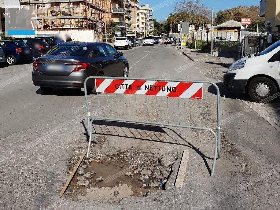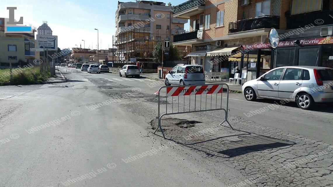 Appare quasi surreale, a Nettuno, il secondo tratto di via della Liberazione, in direzione di Latina. L'importante direttrice di traffico, il cui manto stradale dovrà essere sistemato nel giro di qualche mese, col tratto iniziale dove sono già iniziati i lavori, appare simile a una pista da sci, con tanto di ostacoli per lo slalom gigante.