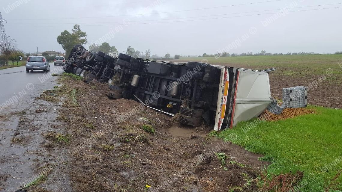 Un camion è uscito di strada e si è ribaltato, probabilmente a causa della forte pioggia, tra Prato Cesarino e Borgo Podgora. Probabilmente è finito fuori strada dopo aver toccato la banchina a lato della carreggiata. Sul posto è intervenuta una ambulanza del 118 che ha trasportato il conducente in ospedale anche se le sue condizioni non dovrebbero essere gravi. I vigili del fuoco sono intervenuti per rimuovere il mezzo incidentato. L'autoarticolato trasportava kiwi.