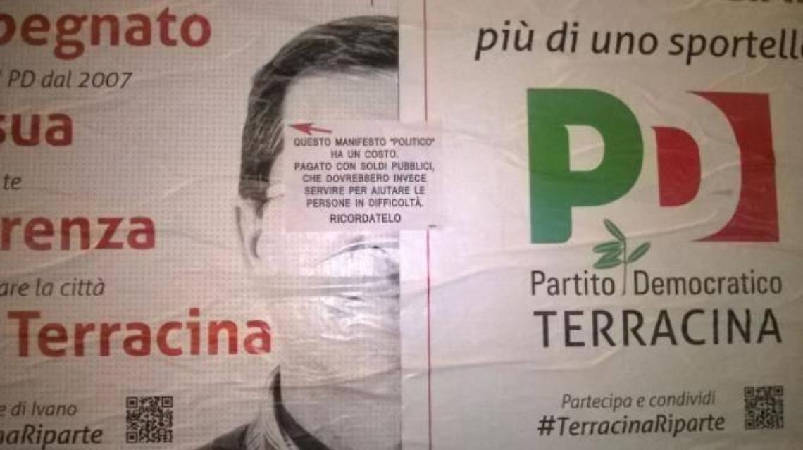 Sono stati imbrattati forse perché davano fastidio. Nonostante fossero regolarmente affissi, in spazi destinati ai manifesti e con tanto di timbro dell'Ica. Quindi, tutto regolare ma evidentemente era il messaggio politico che hanno voluto colpire. Nelle ultime notti diversi manifesti elettorali del Partito Democratico di Terracina sono stati imbrattati o ricoperti da altri cartelli dal contenuto eloquente: "Questo manifesto politico ha un costo pagato con soldi pubblici che dovrebbero invece servire per aiutare le persone in difficoltà". Dal momento che non si è trattato di un episodio isolato, il coordinatore cittadino del Pd Ivano Giuliani ieri ha presentato una denuncia al Commissariato di polizia di Terracina affinché si faccia luce sull'episodio.