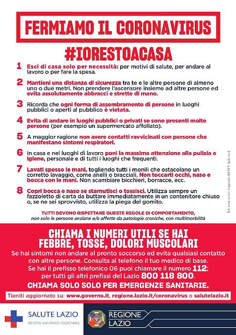 «La campagna informativa - evidenziano dalla Regione - richiama all'attenzione di tutti i cittadini i numeri da chiamare in caso di necessità: se si hanno sintomi non andare al pronto soccorso ed evitare qualsiasi contatto con altre persone. Consultare al telefono il medico di base. Chi ha prefisso telefonico 06 può chiamare il numero 112; per tutti gli altri prefissi del Lazio 800 118 800. È importante chiamare solo per le emergenze sanitarie».