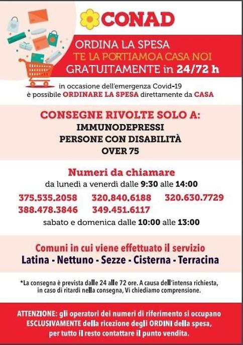 Conad al servizio dei consumatori più in difficoltà in questo momento di emergenza e restrizioni per quanto riguarda il rischio sanitario per il Covid- 19 e gli spostamenti limitati per arginare l'esposizione al possibile contagio del Coronavirus. Sono stati attivati i numeri da chiamare per ordinare la spesa e farsela consegnare direttamente a casa. Un servizio rivolto alle persone con disabilità, immunodepressi e over 75 dal lunedì al venerdì dalle 9.30 alle 14. I numeri sono 3775352058 - 3208406188 - 3206307729 - 3884783846 - 3494516117. I comuni in cui è attivo il servizio sono quelli di Latina, Nettuno, Sezze, Cisterna e Terracina.