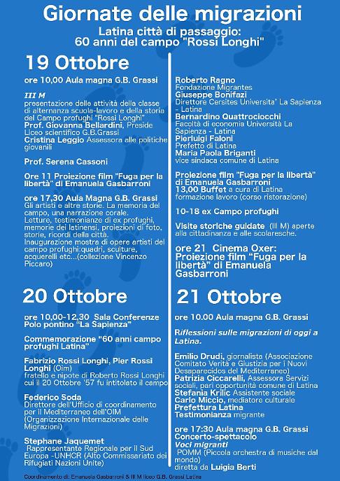 Gli eventi della tre giorni si svolgeranno il 19, 20 e 21 ottobre presso la sala conferenze del Liceo scientifico G.B Grassi e la sede dell'Università La Sapienza, a Latina. Includono conferenze, reading, visite guidate al campo, proiezioni, esposizioni, concerti, racconti e testimonianze. Nell'ambito della rassegna verrà proiettato il documentario "Fuga per la libertà", di Emanuela Gasbarroni, di recente selezionato in concorso al festival Internazionale "Visioni dal mondo". Nella giornata del 20 ottobre interverranno il nipote e il fratello di Roberto Rossi Longhi che, dopo aver pianificato per conto del Cime la ricollocazione delle migliaia di rifugiati ungheresi, morì per un tragico incidente pochi mesi prima dell'inaugurazione del campo. Saranno presenti inoltre molti ex rifugiati giunti per l'occasione dal Canada, dagli Stati Uniti e dalla Francia. Il pomeriggio del 19 sarà dedicato agli artisti in mostra presso l'ex campo profughi, alle testimonianze e ai racconti di persone di Latina che ricordano questa pagina di storia importante della nostra città.