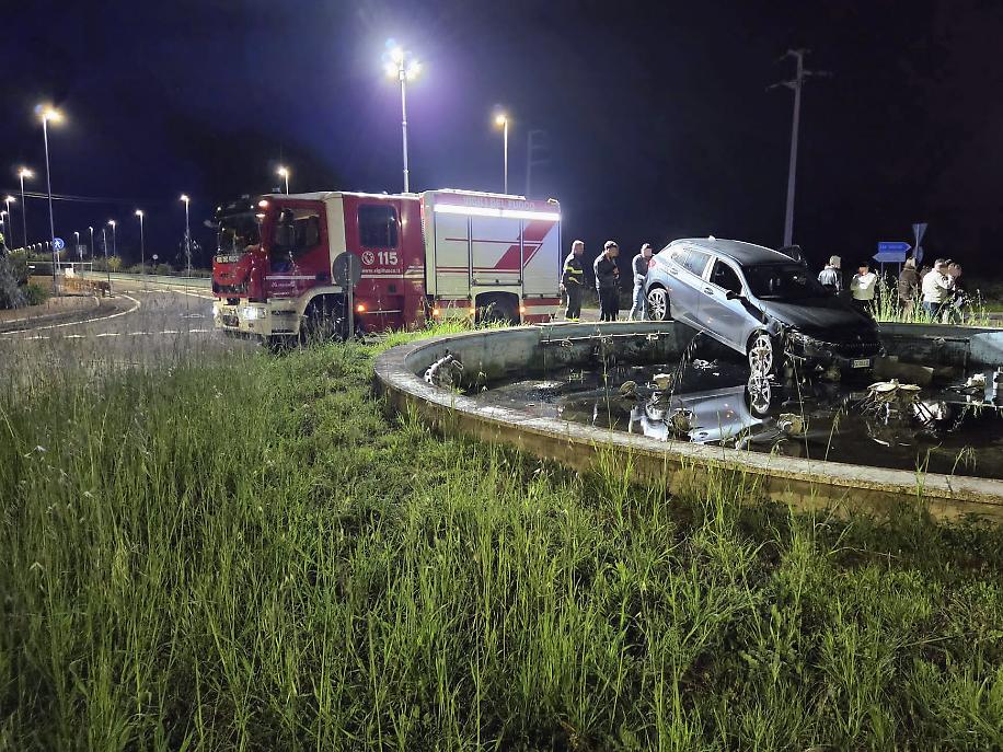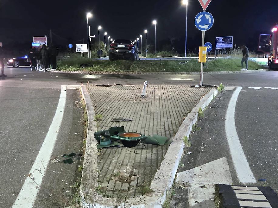 Rocambolesco incidente all'incrocio tea viale Pennacchi e la strada Litoranea, al lido di Latina, dove un'auto è finita diritta contro la rotatoria, fermandosi all'interno della fontana scenica fuori uso da molti anni.
