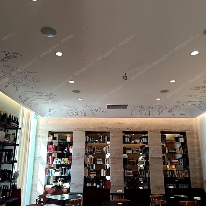 «I riferimenti all’architettura della città – spiegano gli architetti Fabio Gnessi e Umberto De Zardo - sono evidenti nell’impianto strutturale, ma la rigidità razionalista è addolcita dal linguaggio onirico delle decorazioni. Le figure del soffitto, ispirate all’universo creativo di Jean Cocteau e Joan Mirò mimano una danza nello spazio, conferendo alla sala un’aura teatrale dove ordine e sogno trovano perfetto compimento nel bancone del bar, la cui struttura riprende nella forma la “Fontana del grano", realizzata nel 1934 dall’architetto Oriolo Frezzotti».