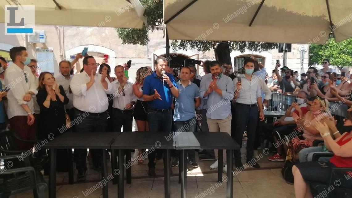 Inevitabile il passaggio su Terracina: «A Terracina ci torno perché qua, più che in altri Comuni, la Lega ha mosso i suoi primi passi. Qua ci saranno le elezioni comunali e il centrodestra deve essere unito e compatto perché, se domani scenderemo in piazza per mandare a casa il Pd a Roma, non si può tenere il Pd a Terracina. Li vogliamo mandare via dal Governo enon possiamo portarli in Comune a Terracina».