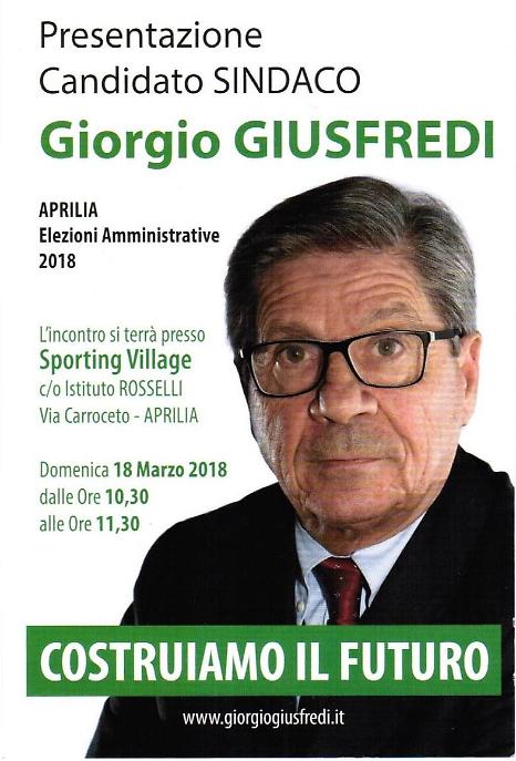 La notizia era ormai sicura da quasi un mese ma nelle ultime ore è arriva l'ufficialità: Giorgio Giusfredi si candida a sindaco della città. La presentazione si terrà domenica 18 marzo (ore 10.30) nella sala conferenza dello Sporting Village in via Carroceto, in quel contesto Giusfredi illustrerà le motivazioni che lo hanno portato a prendere questa decisione e gli obiettivi e le prospettive del suo progetto politico. "Il passato non ci deve far perdere la speranza di realizzare - afferma il candidato - un futuro migliore per noi e soprattutto per i giovani. Con me ci saranno coloro che hanno condiviso con me piccoli e grandi obiettivi nelle realtà sociali che sono parte della mia vita: la scuola e lo sport". Al momento sembra che l'idea sia quella di un progetto civico, visto che sul volantino di presentazione non ci sono simboli di partito ma solo il messaggio "Costruiamo il futuro". Tuttavia è noto l'interesse che il centrosinistra ha maturato nei suoi confronti.