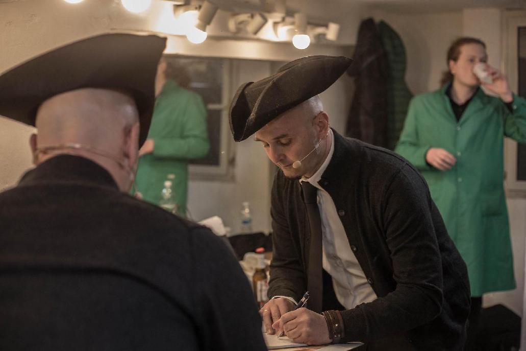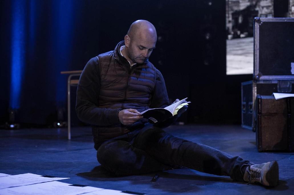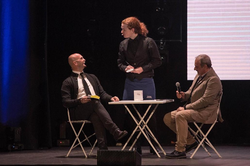 Lo ha fatto di monologo in monologo, cardigan scuro, camicia bianca e cravatta nera, tirando fuori da un baule tanti oggetti-metafora. Seduto al tavolino di un bar immaginario (ma nemmeno tanto), Procaccini consuma bevande ma il conto non lo paga mai. «Segna, Tiberio, segna». In tre ore si è andati dal giorno dei dipendenti in assemblea per lo stipendio, alla relazione sulla scrivania ad attenderlo dal titolo: "Dissesto finanziario e discordanze contabili". Dall'imprenditore (impersonato da Mimmo De Rosa) che va a trovarlo in Comune per dirgli che i debiti del Comune gli hanno rovinato la vita, ai viaggi della speranza dal presidente del Consiglio Berlusconi in quei giorni alle prese con lo spread alle stelle (era agosto del 2011) e che trovò solo il tempo per dire al dirigente Ada Nasti: «Lei ha un sorriso bellissimo». Negli intermezzi musicali, le immagini del cantiere ex Desco, scheletro finito in mano alla camorra e ancora sotto sequestro giudiziario, e della piscina comunale, iniziata nel 2008 con i soldi del Coni e mai completata. Gli amministratori di quegli anni, il sindaco Stefano Nardi e la sua maggioranza, non vengono mai nominati. In prima fila, a godersi lo spettacolo, alcuni di quei politici c'erano, martedì.