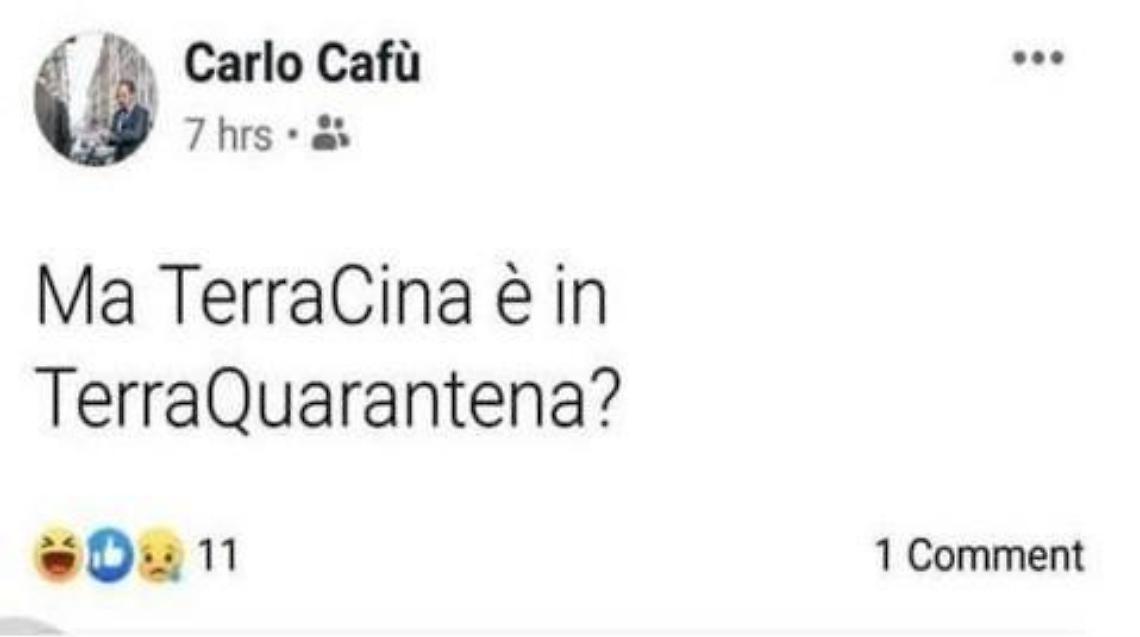 Scoppia il putiferio per una battuta scritta sul suo profilo facebook privato dall'assessore della giunta Raggi Carlo Cafarotti, che ieri ha scritto sulla sua bacheca: «Ma TerraCina è in TerraQuarantena?», una freddura sul Coronavirus che non è piaciuta ai politici terracinesi. La prima a rispondere è stata la sindaca facente funzioni Roberta Tintari, che ha replicato duramente invitando l'assessore al Turismo "promuovere il turismo della Capitale d'Italia e invece trova il tempo di cimentarsi in battute puerili e fuori luogo" e facendo riferimento alle condizioni in cui versa la Capitale rispetto a quelle in cui è Terracina dal punto di vista del decoro. "Sembra la Svizzera rispetto a Roma" e aggiunge: "Da noi i gabbiani accompagnano i pescherecci in porto, non pascolano in pieno centro".