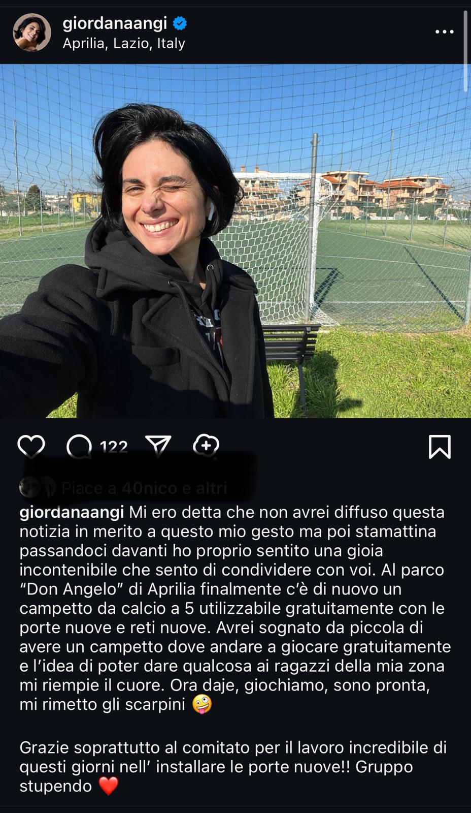 Giordana Angi, la cantautrice di Aprilia, regala porte e reti nuove al campo di calcetto del parco Don Zanardo. «Mi ero detta che non avrei diffuso questa notizia in merito a questo mio gesto ma poi stamattina passandoci davanti ho proprio sentito una gioia incontenibile che sento di condividere con voi - scrive l'artista sui social - Al parco “Don Angelo” di Aprilia finalmente c’è di nuovo un campetto da calcio a 5 utilizzabile gratuitamente con le porte nuove e reti nuove. Avrei sognato da piccola di avere un campetto dove andare a giocare gratuitamente e l’idea di poter dare qualcosa ai ragazzi della mia zona mi riempie il cuore. Ora daje, giochiamo, sono pronta, mi rimetto gli scarpini. Grazie soprattutto al comitato per il lavoro incredibile di questi giorni nell’ installare le porte nuove!! Gruppo stupendo».