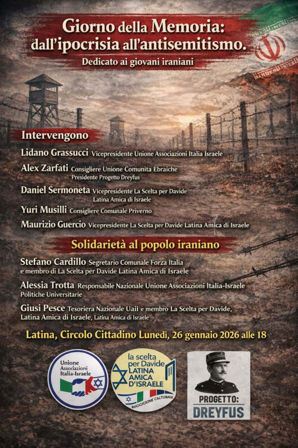 Un confronto pubblico per interrogarsi sul senso del Giorno della Memoria nel presente, tra celebrazioni ufficiali e nuove forme di odio che riaffiorano nella società. È il tema del convegno “Giorno della Memoria: dall’ipocrisia all’antisemitismo”, in programma lunedì 26 gennaio alle 18 al Circolo Cittadino di Latina, dedicato – come indicato nel manifesto – ai giovani iraniani e accompagnato da un messaggio di solidarietà al popolo iraniano.