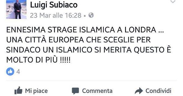 Il bilancio è drammatico. Cinque persone uccise e 40 sono rimaste ferite nell'attentato di mercoledì pomeriggio a Londra, rivendicato poi dall'Isis tramite un'agenzia di stampa. Un'auto impazzita ha investito i pedoni sul ponte di Westminster e l'attentatore, poi ferito a morte, ha ucciso un poliziotto nel tentativo di entrare nel Parlamento inglese. Tutti hanno espresso la doverosa solidarietà al popolo inglese. Ma l'assessore al Bilancio di Pontinia Luigi Subiaco in un post Facebook è andato controcorrente. «Ennesima strage islamica a Londra. Una città europea che sceglie per sindaco un islamico si merita questo e molto di più». Un post sulla scia di quello pubblicato dopo il sisma che ha devastato il centro Italia. «Ai terremotati ci stanno la protezione civile e cittadini comuni volontari perché Esercito, Marina, Carabinieri, polizia, guardia di finanza e coop rosse bianche e verdi sono tutti impegnati nella ricerca affannosa di africani Islamici vari da portare in Italia».