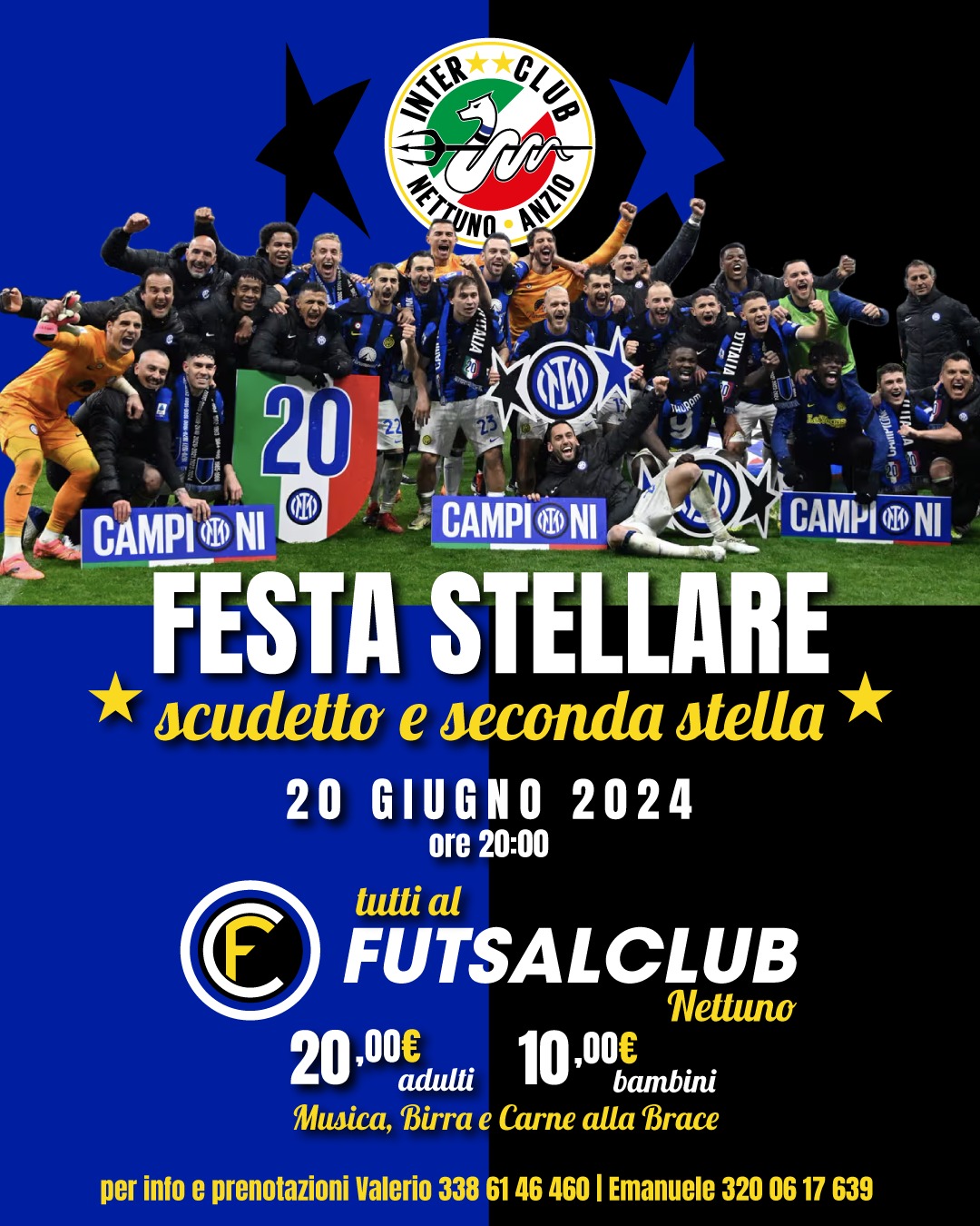 Si terrà giovedì 20 giugno, alle ore 20.00, presso il FutsalClub in via Cadolino n. 6 a Nettuno (RM) la Festa Stellare organizzata dall’Inter Club Nettuno-Anzio per festeggiare la vittoria del ventesimo scudetto e della storica seconda stella.